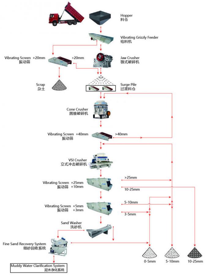 Big stones blasted from mountain are fed into jaw crusher evenly through vibrating feeder for primary crushing, coarsely crushed materials will be transferred to impact crusher by belt conveyor for secondary crushing. After secondary crushing finish, the crushed stones will be sent to vibrating screen for separating to get different sizes final products. After separating, the parts that can meet standard will be transferred away as final products, while the other parts will be returned to impact crusher for further crushing, thus forming a closed circuit.